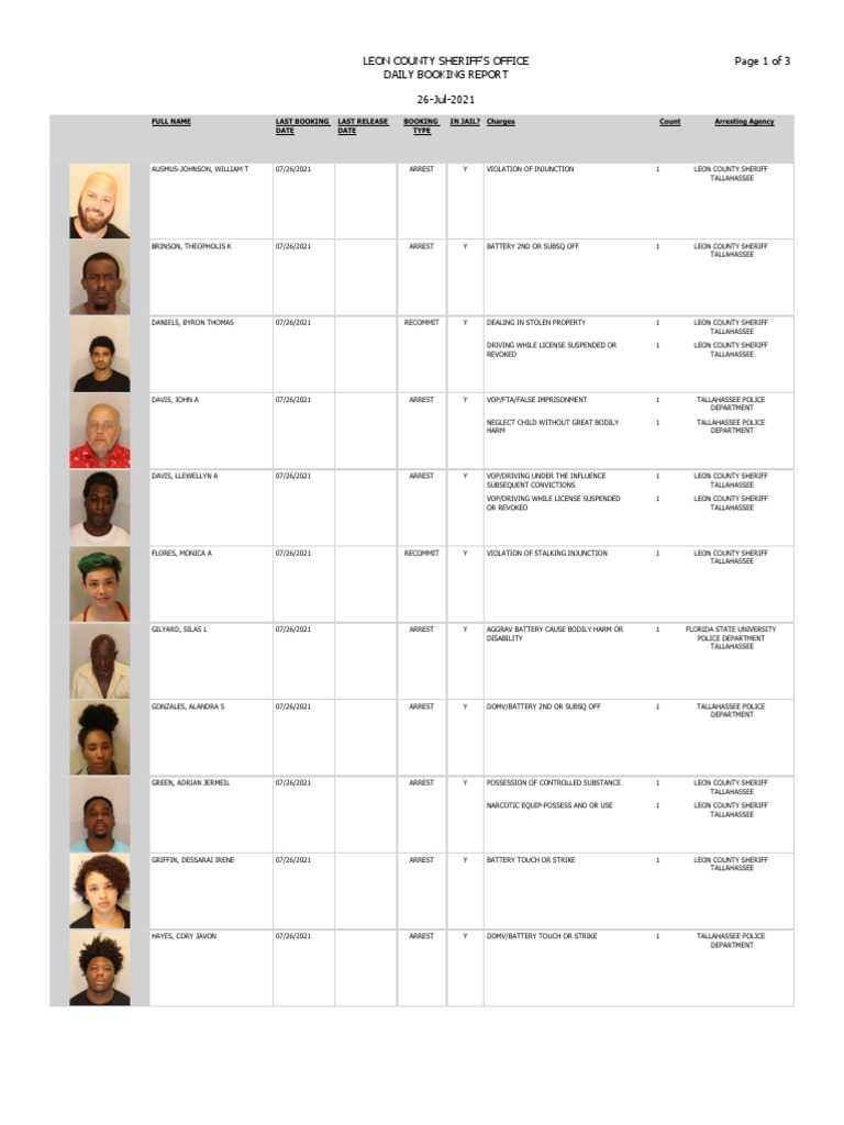 . Leon County Booking Report. WCTV - Below is a PDF file containing all bookings at the Leon County Detention Facility from August 26 2021. Home Unlabelled Tallahassee Booking Report October 2021 - Leon County Booking Report Oct 17 2021 Pdf Justice Crime Violence You can view the jul 22 2021 leon county booking report.